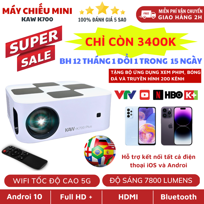 Máy chiếu KAW K700 Plus, Kết nối mọi thiết bị, Xem Youtube Tivi Netflix