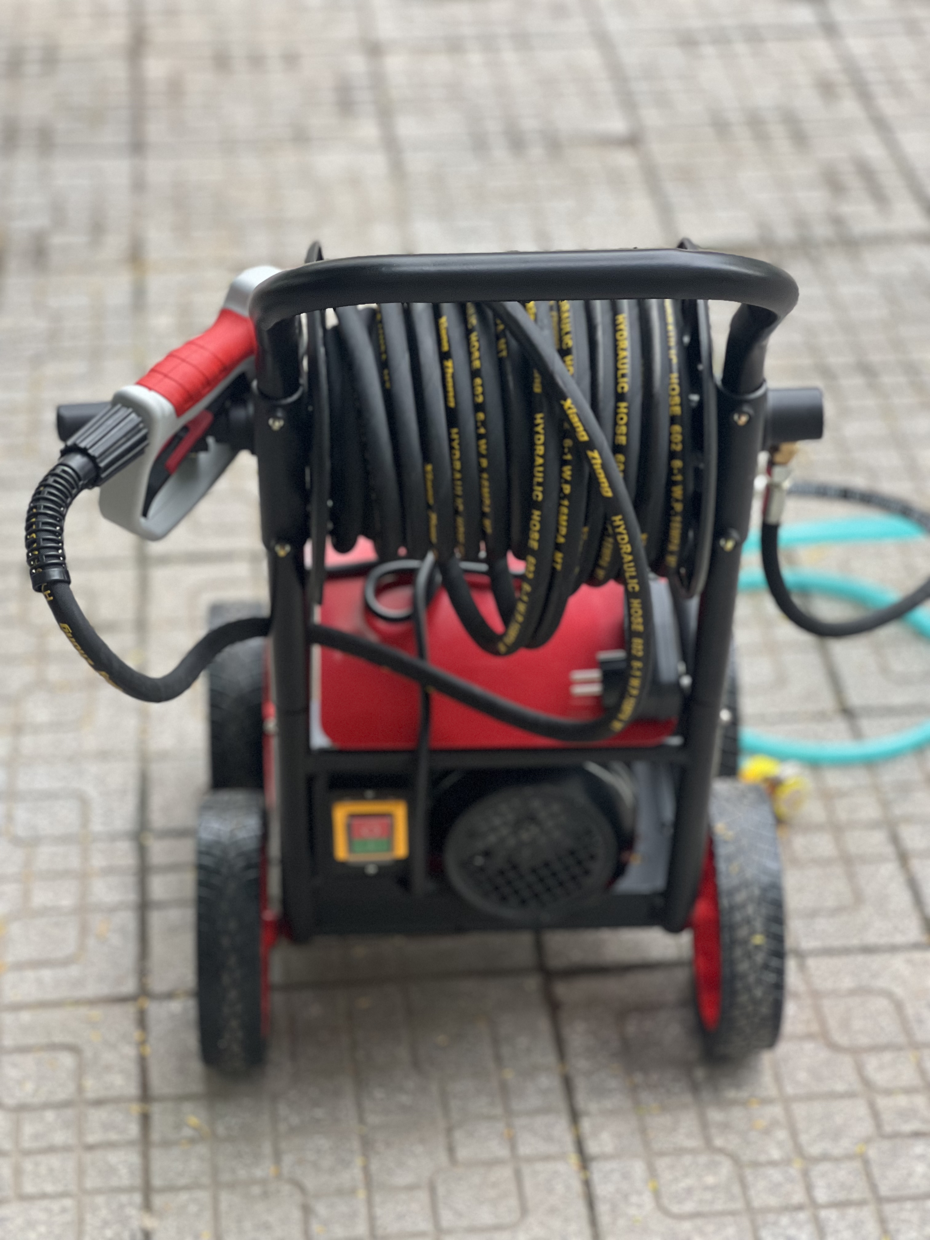 Thiết kế nhỏ gọn, dễ di chuyển với bánh xe lớn và tay cầm tiện lợi, máy không chỉ là trợ thủ đắc lực để rửa ô tô, xe máy mà còn đáp ứng nhiều nhu cầu khác như vệ sinh sân vườn, chuồng trại, ban công, tường rào hay tưới cây.